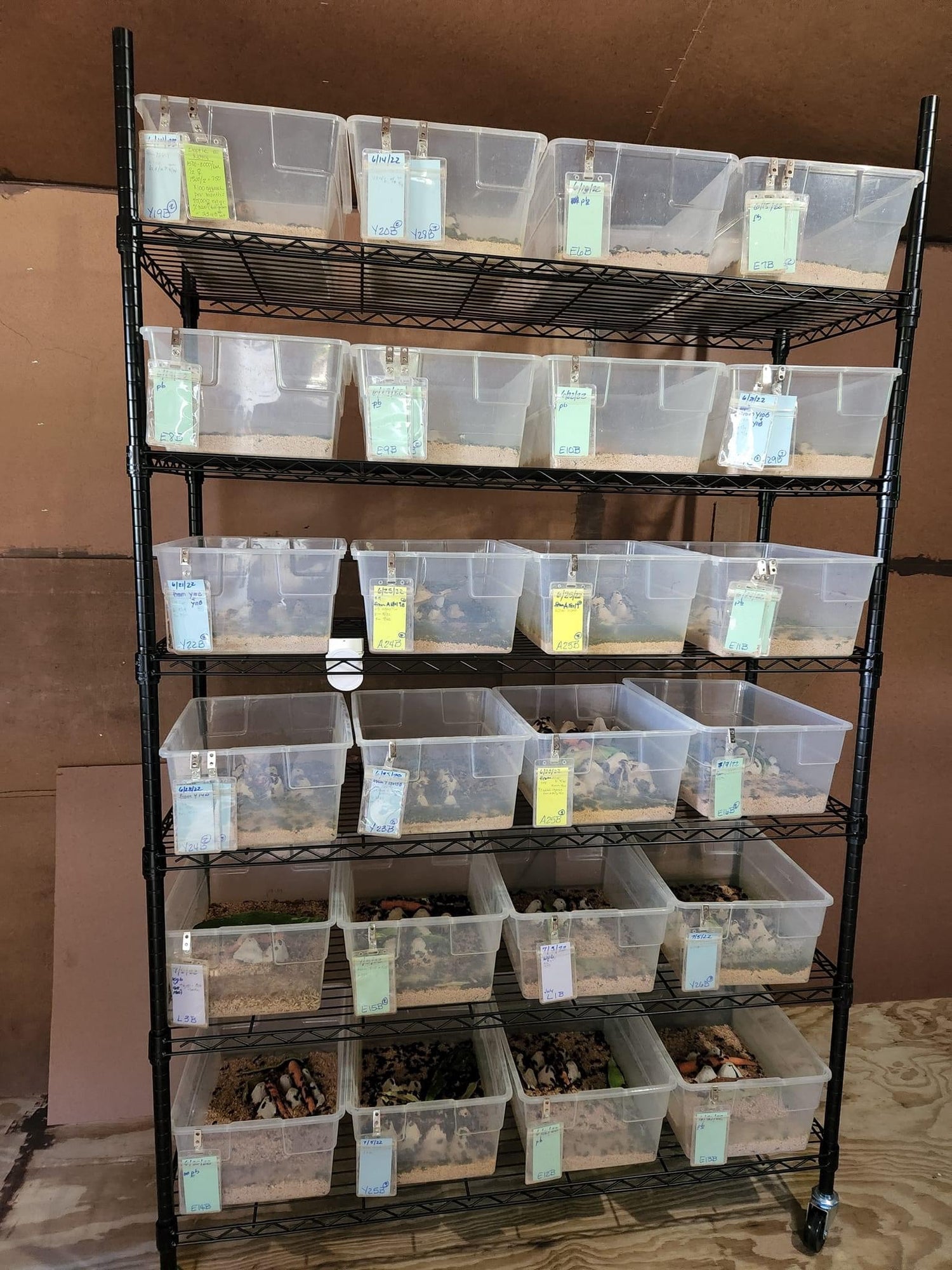 Beetles live in bins and are removed every two weeks to allow the babies to grow undisturbed.